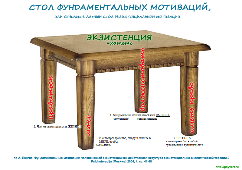 Personally, I am a representative of the school of existential analysis. This method is close to me not only because of its effectiveness, but also because of its depth and involvement with the very foundations of human nature. A fulfilled life, from the point of view of existential analysis, stands on four pillars, which can be compared to the legs of a table — take one away, and the structure becomes unstable.