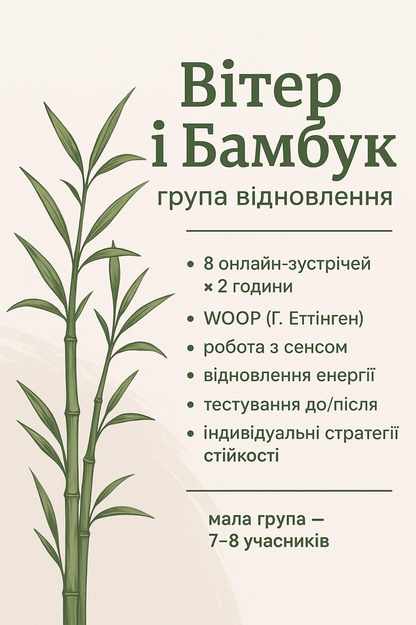 Запрошуємо вас приєднатися до психотерапевтичної групи «Вітер і Бамбук» — безпечного та підтримувального простору, де ми разом досліджуватимемо, як залишатися гнучкими й водночас стійкими перед викликами життя. Група створена для тих, хто прагне глибше зрозуміти себе, знайти внутрішні ресурси та навчитися відновлювати енергію навіть у періоди стресу.